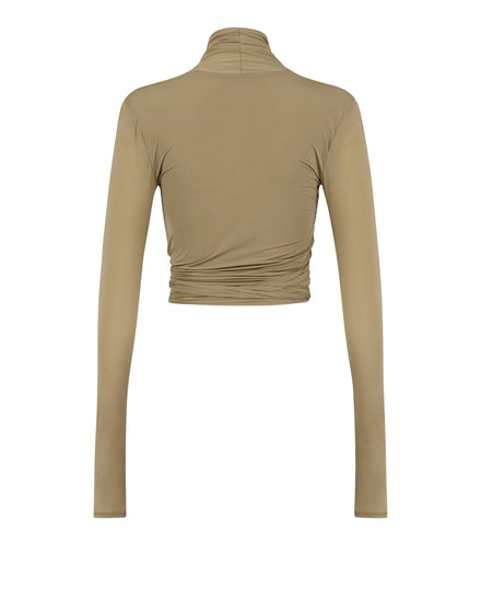 Slightly cropped, high neck wrap top. Extra long sleeve detail. Sheer arms, solid body. Can be worn as a layering piece or of course, on its own as a beautiful, demure, sexy and chic wrap top.